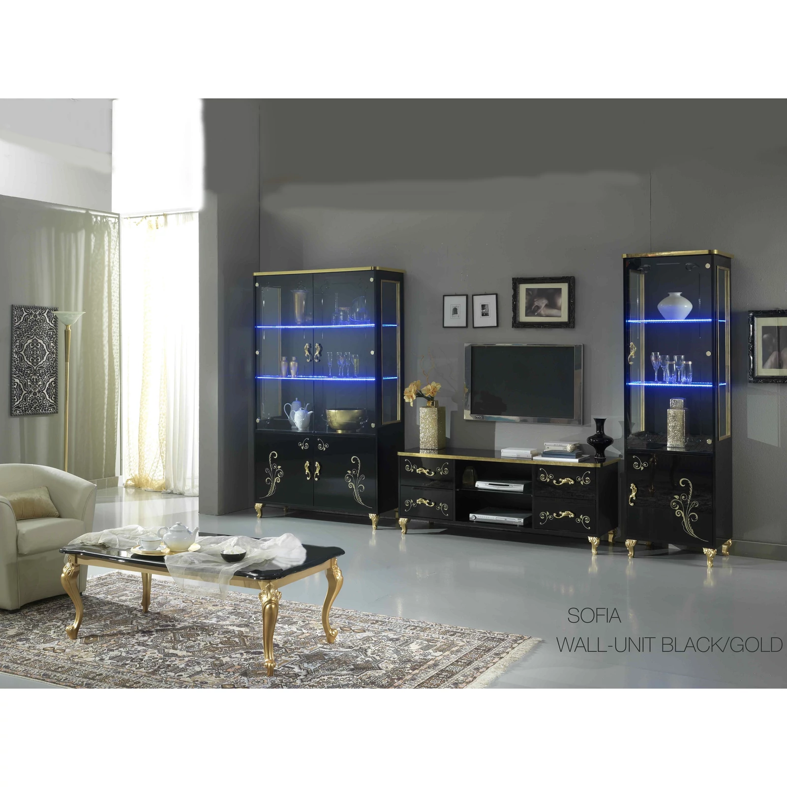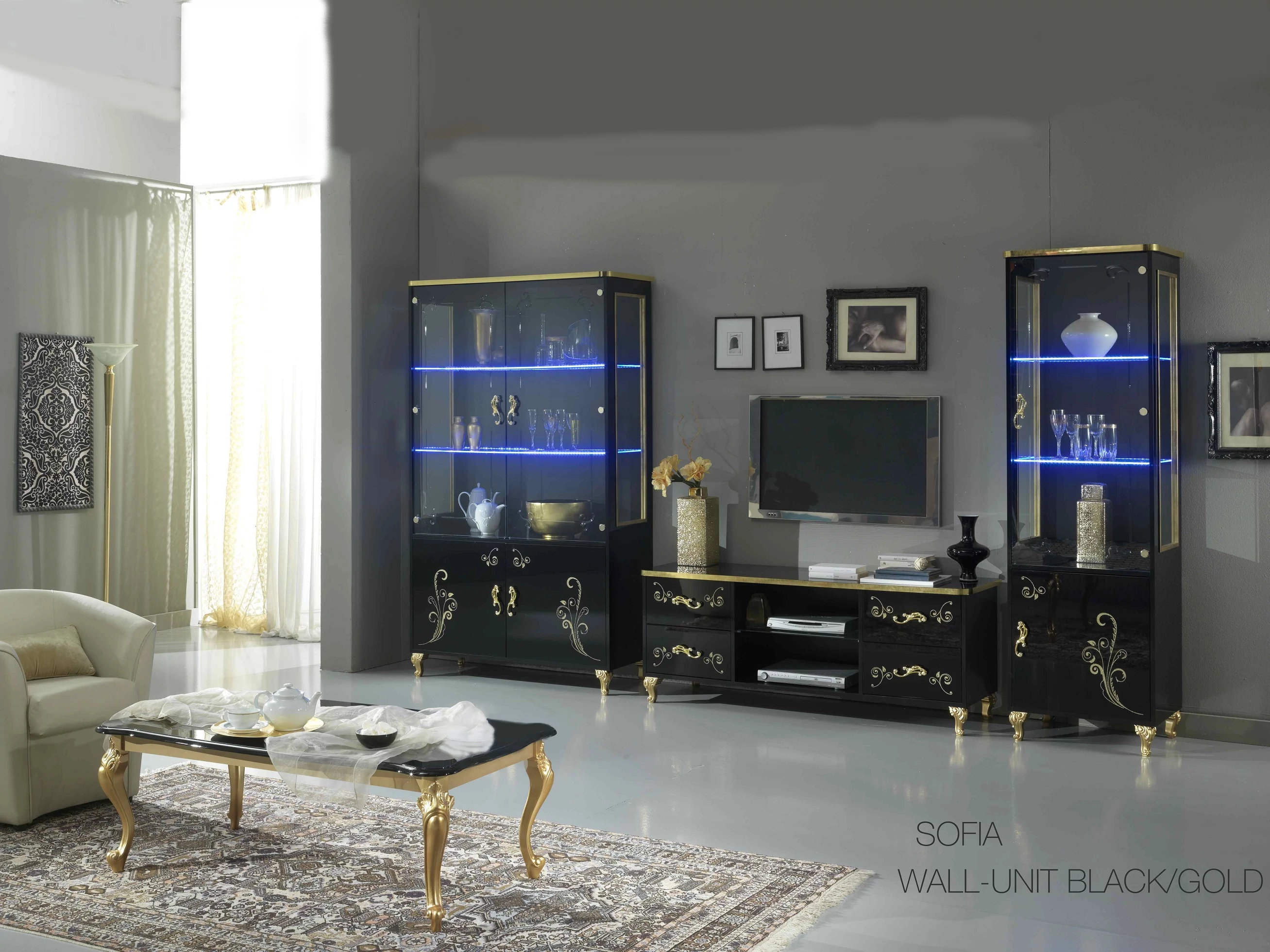 - BC Sofia Day 2-doors display cabinet - black-gold: 1180mm x 460mm x 2050mm