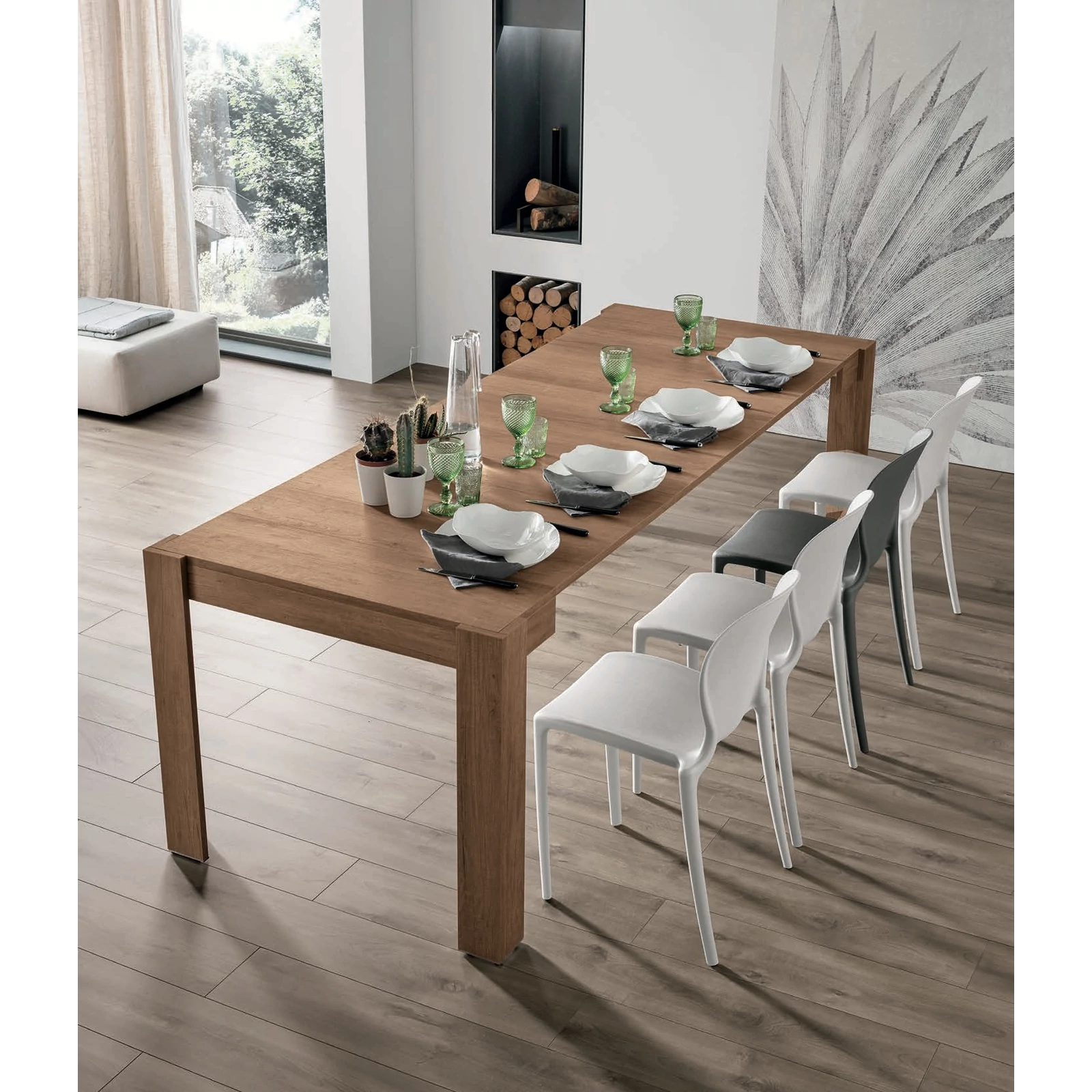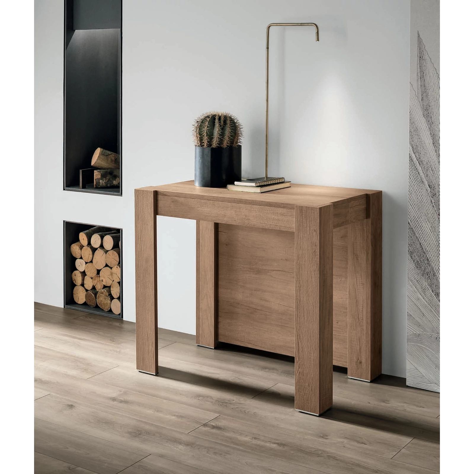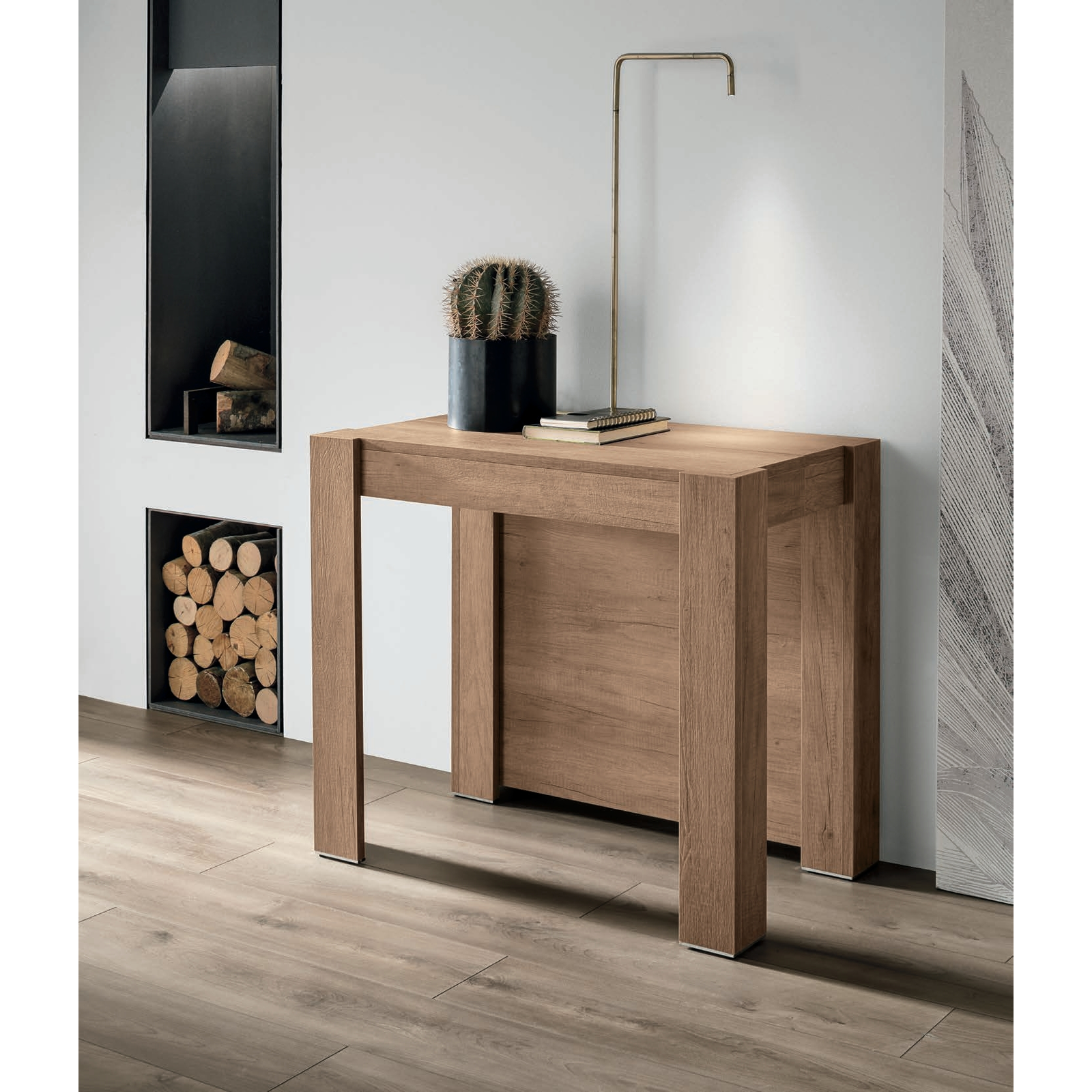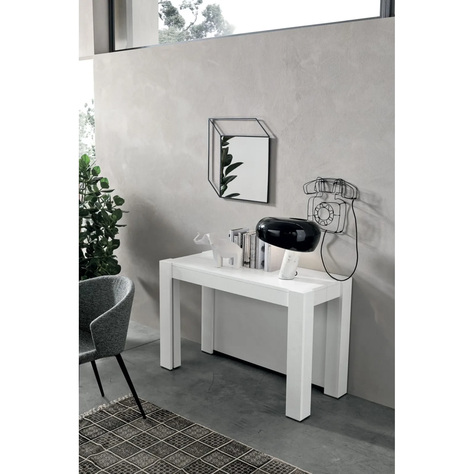 The Fiesta extendable console table, thanks to its transforming mechanism, remains discreet and elegant when closed, but can easily be turned into a large, practical table when needed. It is available in a rectangular version with a structured matte finish.