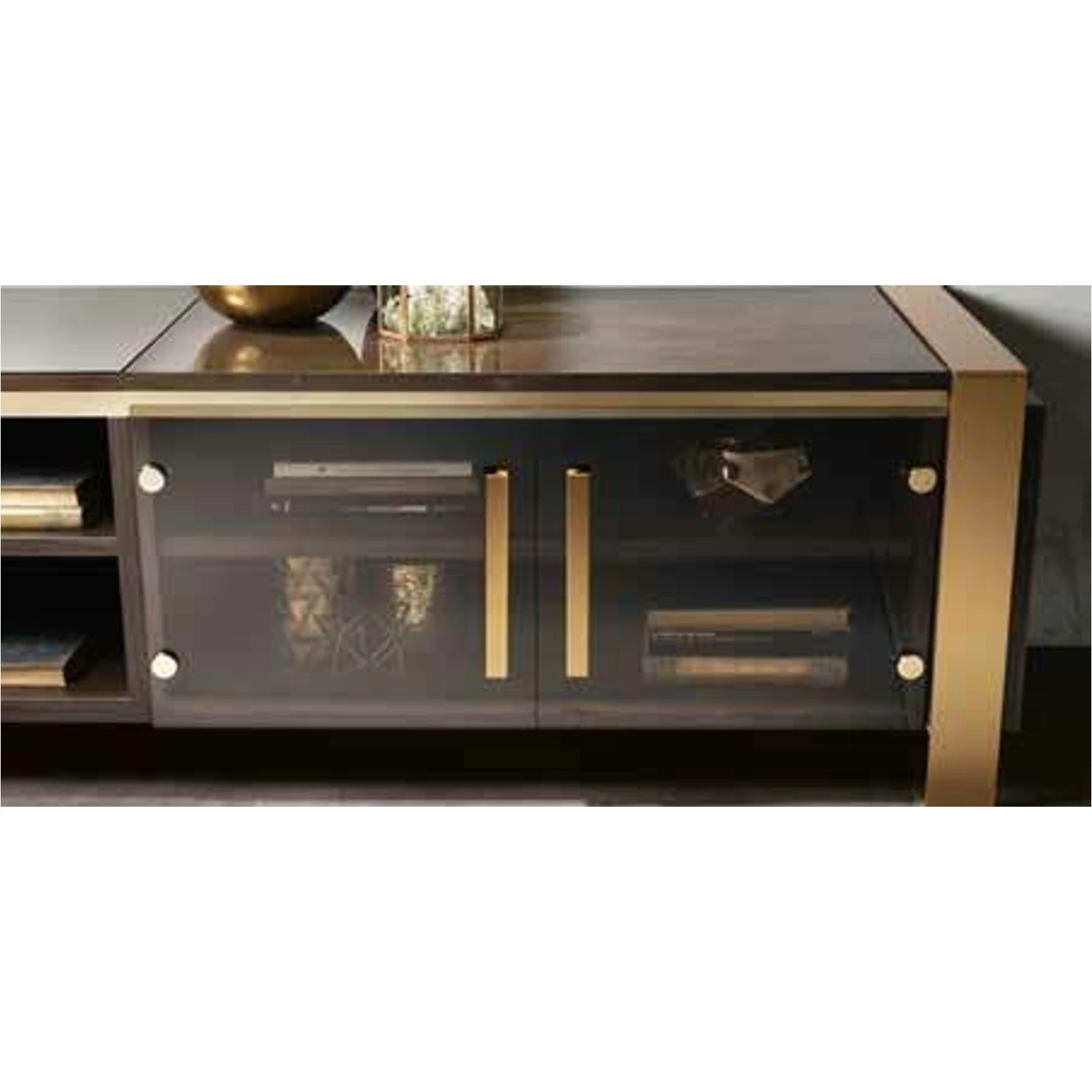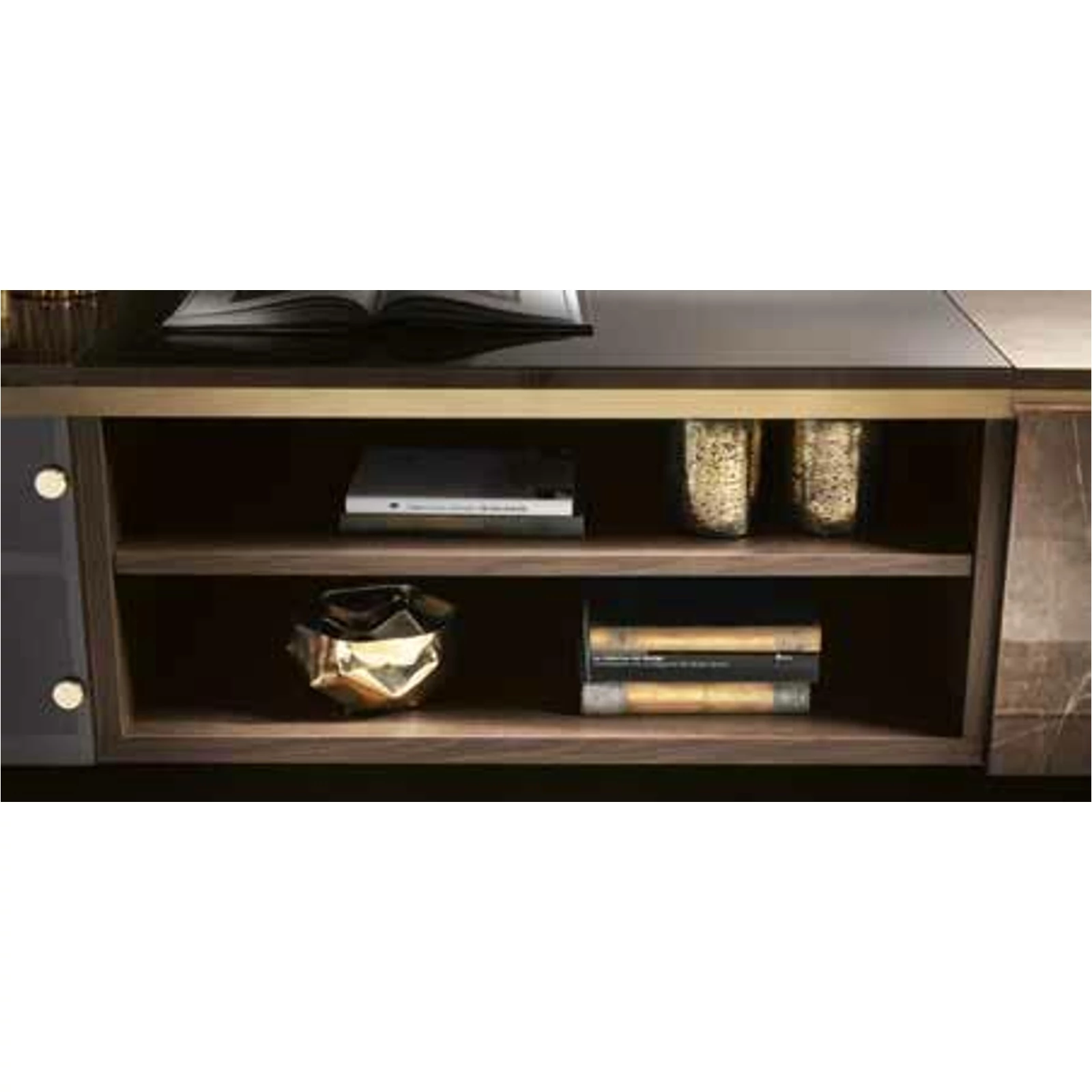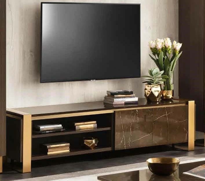 Essenza is the new Collection of the brand Adora, that includes furnishing elements for your living room, dining room and bedroom. This collection embodies contemporary elegance in small details that define the research for aesthetics, accomplished to create every piece of furniture. The concept is inspired by the classic / contemporary dualism, and by the contrasting textures of two precious finishes, embellished by elegant golden details. The contrast between the dark hues of wenge wood and the shining marble finish, with its typical bronze veins, is the leitmotiv behind this collection. The complete collection is enhanced by the satin-finish golden elements used for the metal handles of the nightstands, the frames of the display cabinets, dining room tables and living area furniture.
