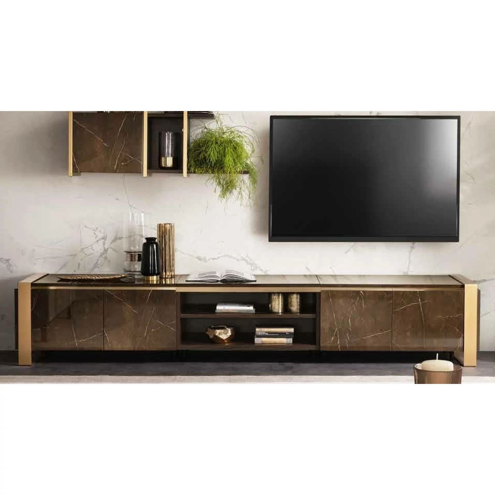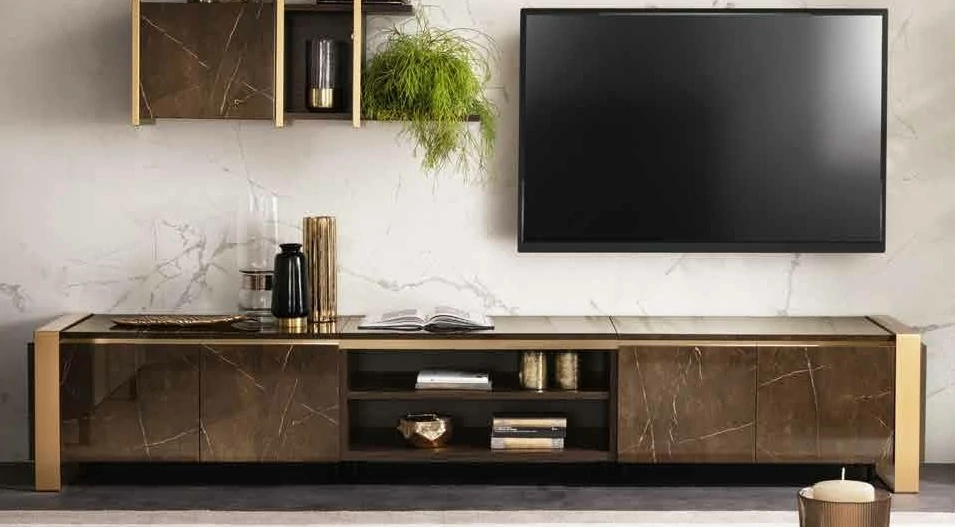 Essenza is the new Collection of the brand Adora, that includes furnishing elements for your living room, dining room and bedroom. This collection embodies contemporary elegance in small details that define the research for aesthetics, accomplished to create every piece of furniture. The concept is inspired by the classic / contemporary dualism, and by the contrasting textures of two precious finishes, embellished by elegant golden details. The contrast between the dark hues of wenge wood and the shining marble finish, with its typical bronze veins, is the leitmotiv behind this collection. The complete collection is enhanced by the satin-finish golden elements used for the metal handles of the nightstands, the frames of the display cabinets, dining room tables and living area furniture.