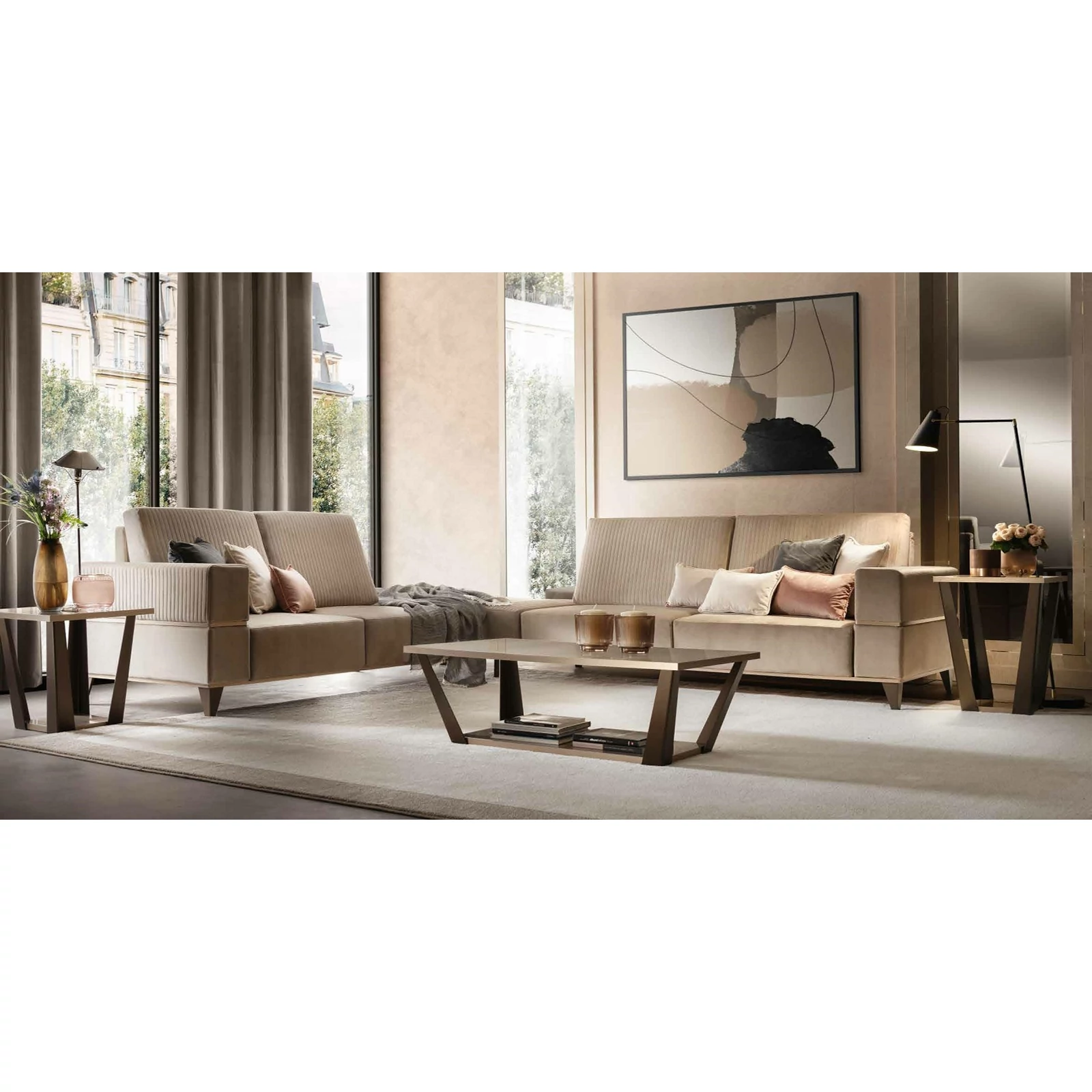 Ambra is the new Collection of the brand Adora, that includes furnishing elements for your living room, dining room and bedroom. Once again, Adora has left its unmistakable hallmark on furniture items that fly the flag for the prestige of Italian style and for the Italian flair for furniture with elegance and an inimitable contemporary flavour. The contrasting textures and the dissimilar volume effects between the different surfaces are sophisticated details that do not remain unnoticed and give character to each single furniture element. The structure of the furniture items in elm-wood finish forms an elegant contrast with the textured, open-pored doors, which are overlaid with marble-finish panels. Furnishing solutions with stylish, elegant silhouettes repeat the same contrasting effect that is enhanced by the satin-finish bronze profiles of the handles and feet. Another feature worth noting is the balance of delicate shades that add their own touch of elegance to each piece, with bright reflections from mirrored glass that, like a jewel, give luminosity to the whole furniture composition.