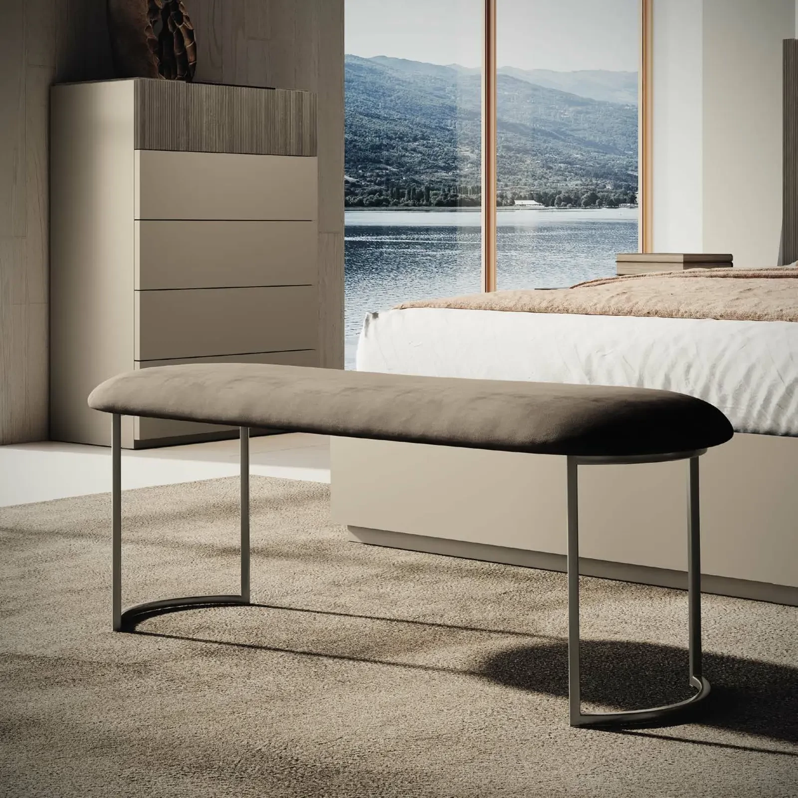 The bench brings a sense of modern lightness and Italian sophistication, creating a distinctive atmosphere in the bedroom. Its charm lies in the refined details, making it a subtle yet impactful addition to the space.