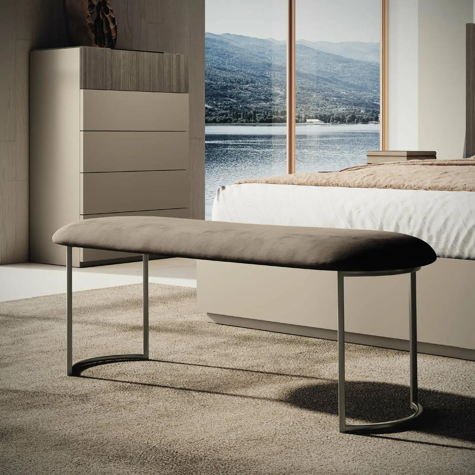 The Essenza bench is an elegant Italian bedroom accessory, featuring a comfortable padded seat and slim metal legs. It is both practical and decorative, suitable for placement at the foot of the bed or as a standalone piece anywhere in the room.