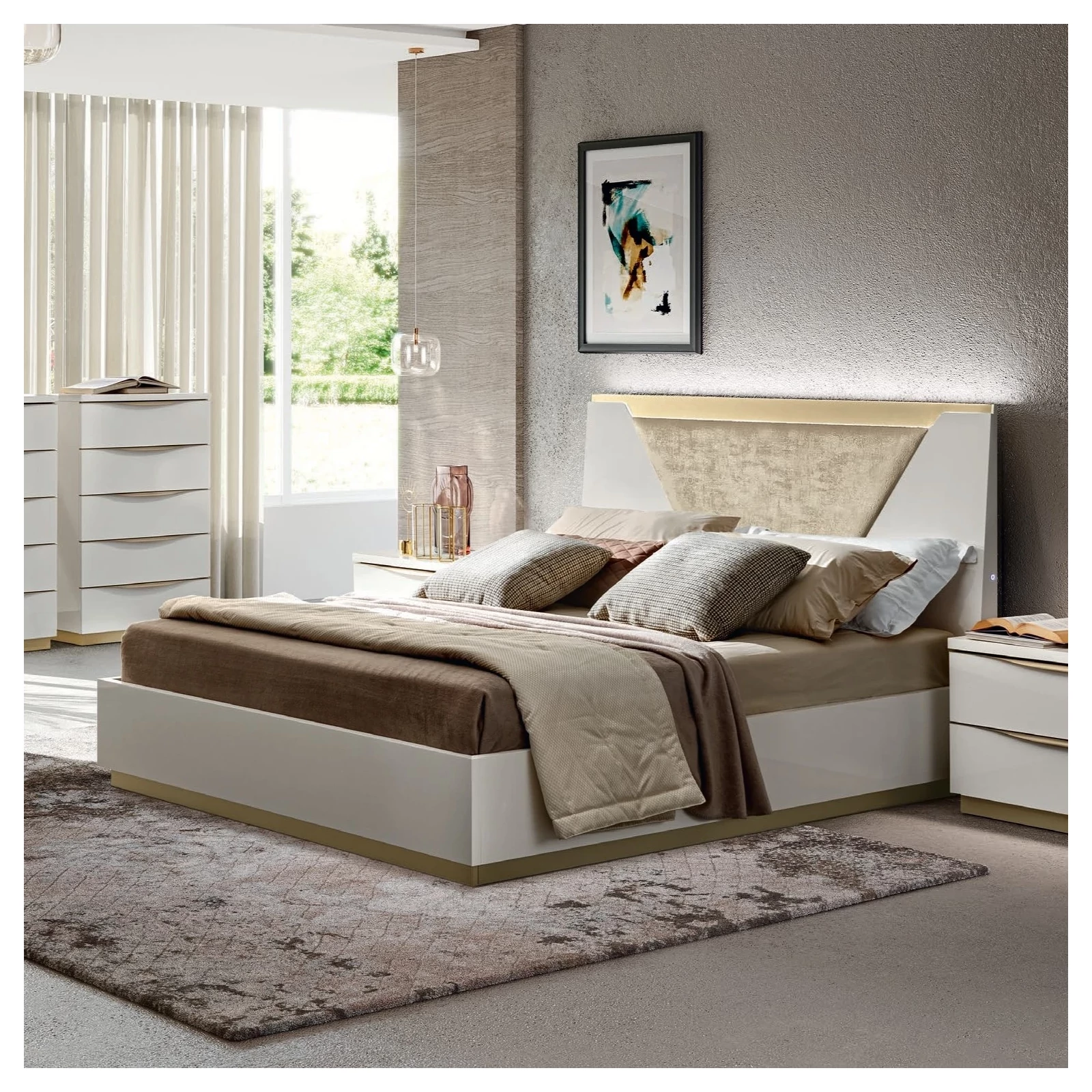 The Kharma bed combines a glossy white finish with a sophisticated padded fabric headrest, offering modern Italian design in a luxurious style. Equipped with dimmable lights on each side and a backlit Venetian glass panel, this bed radiates warmth and elegance, bringing a touch of Italian quality to your bedroom.