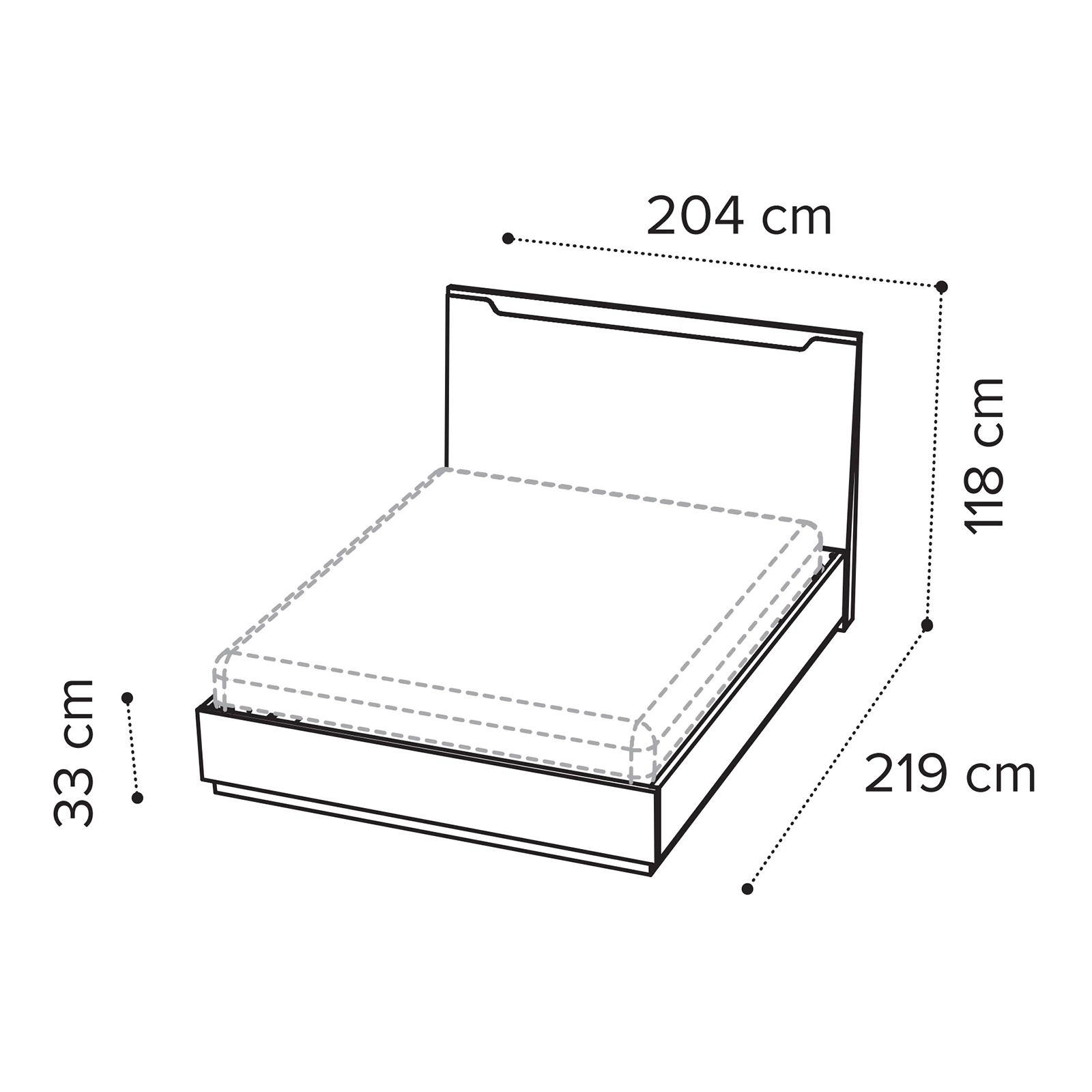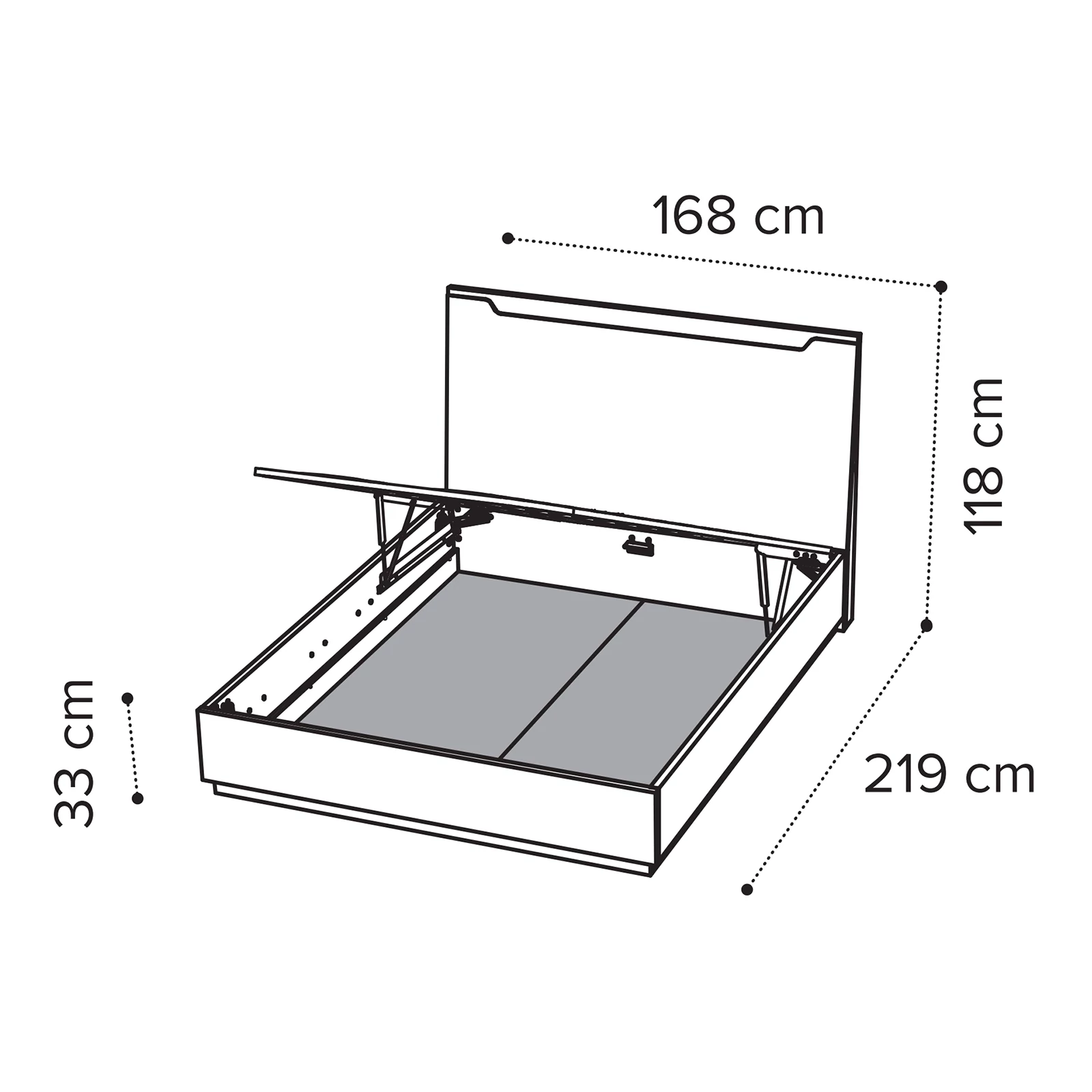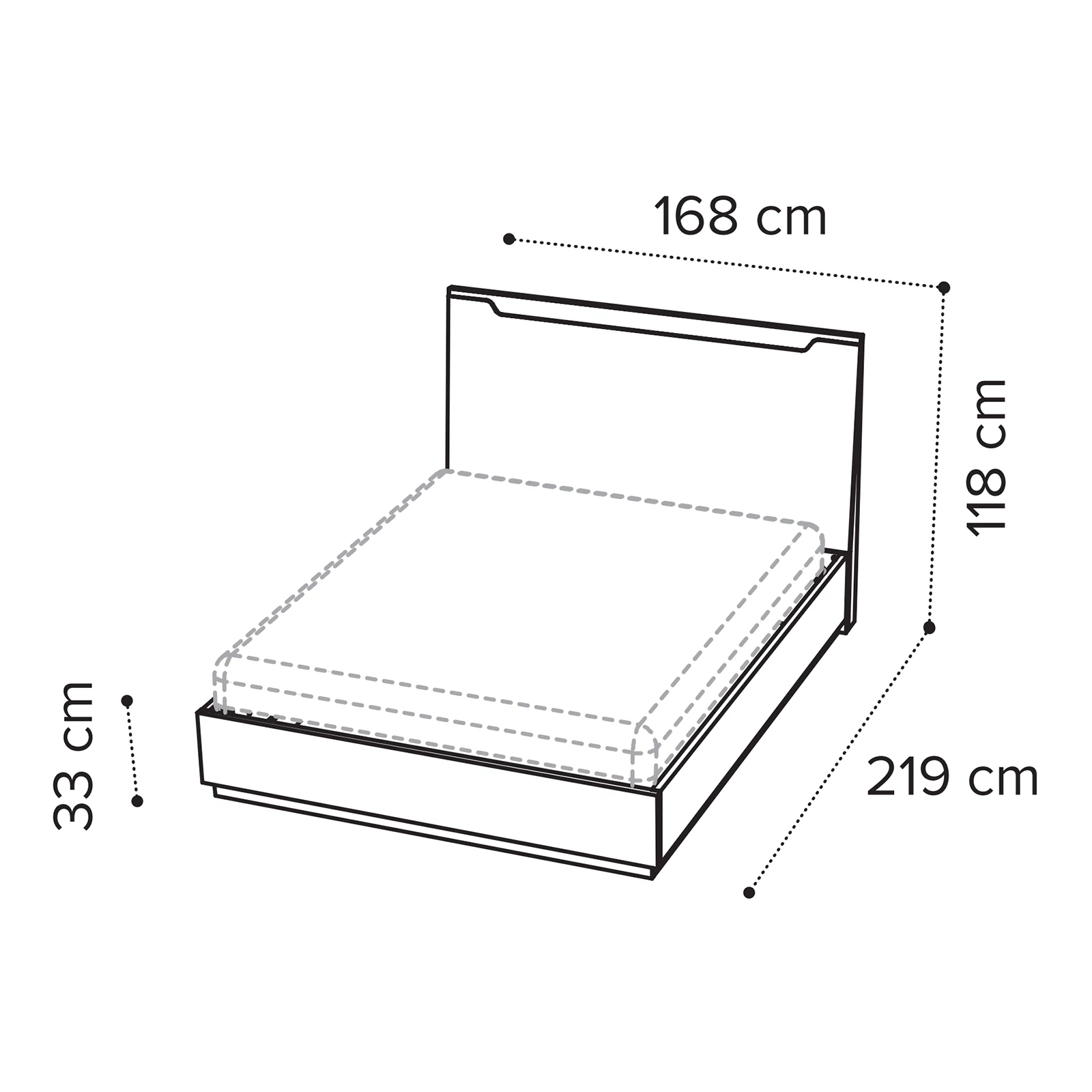 - 160x200 cm version: 168×219×118 cm