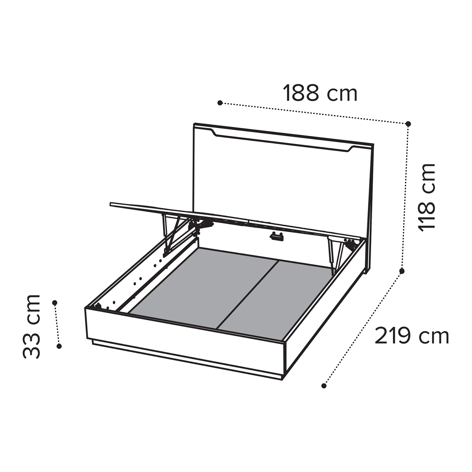 - 180x200 cm version: 188×219×118 cm