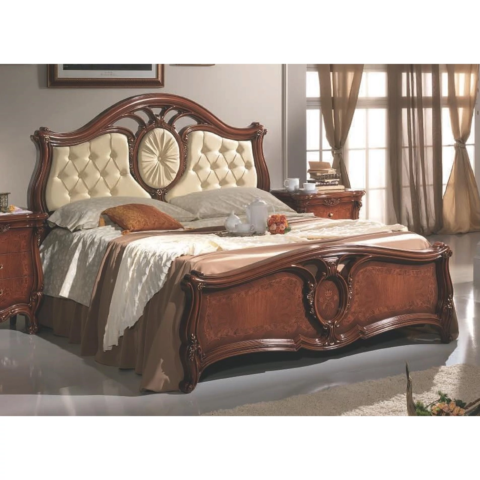Headboard and footboard cornices in wood effect. Panels in particle board, with decorative veneer and inlaid type decorations and polyester coating with semigloss finish. Upholstered and studded in faux leather with Swarovski button studs. It is possible to vary the type of leatherette or upholster with fabric on request.
