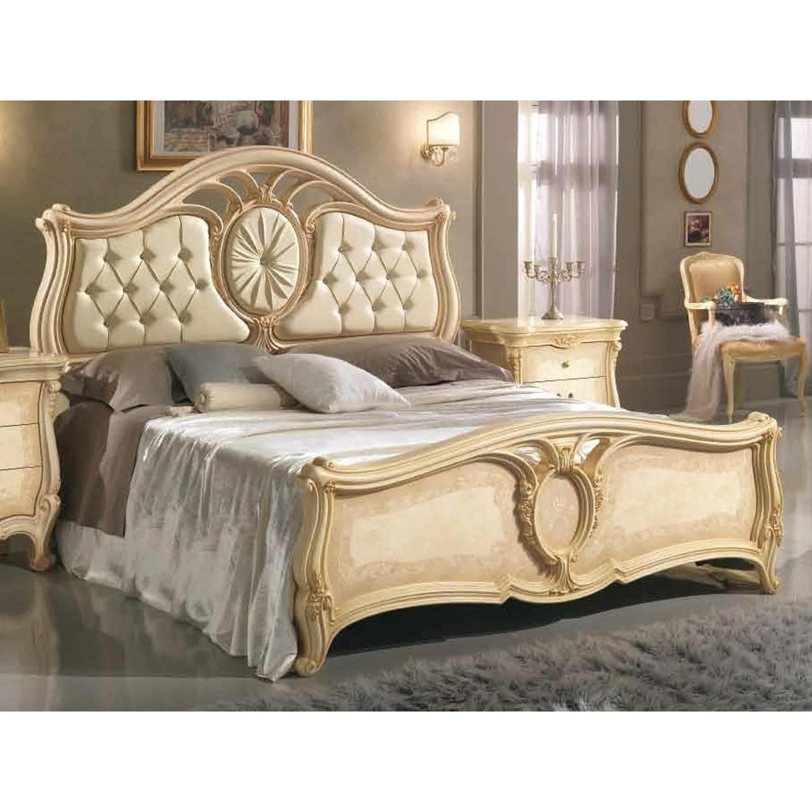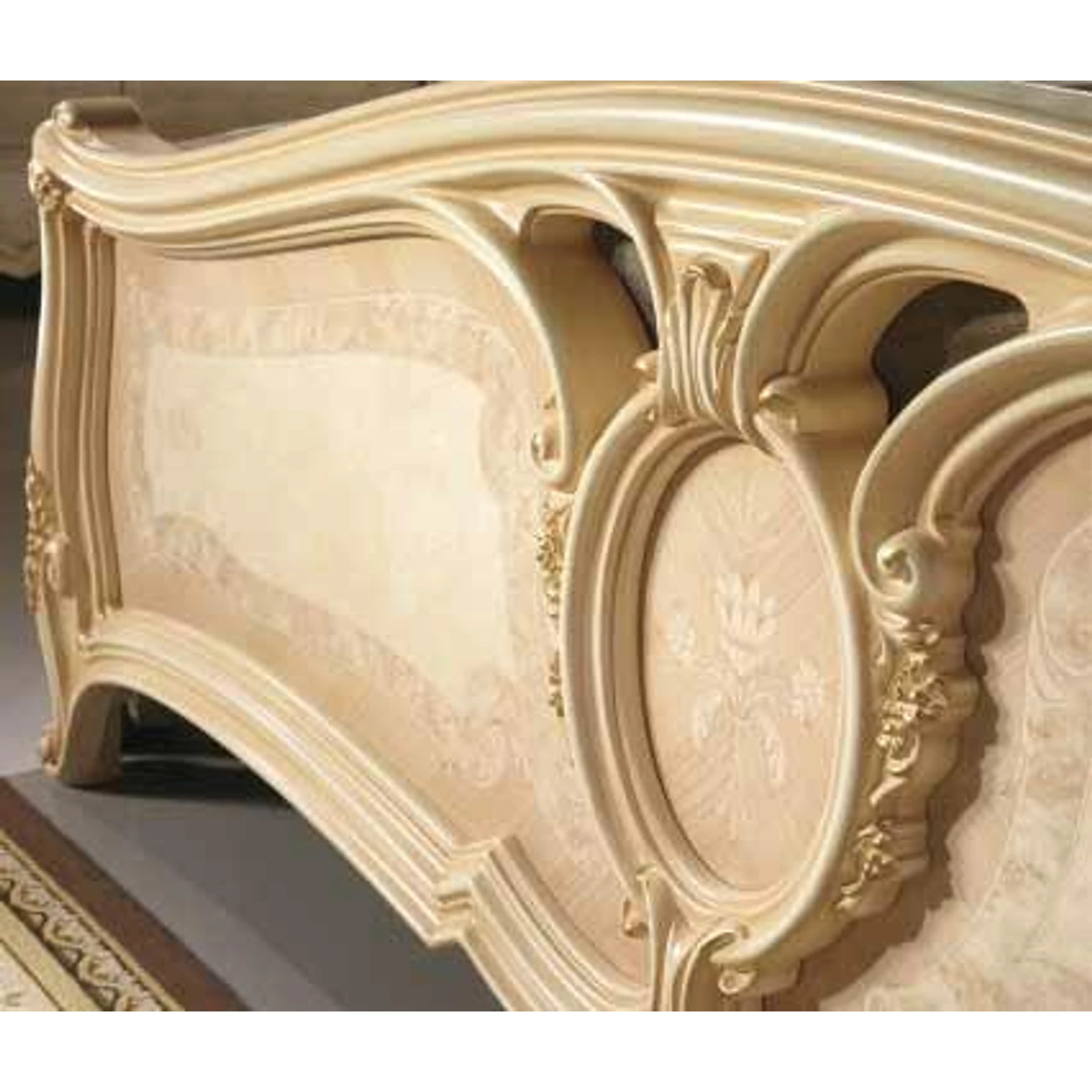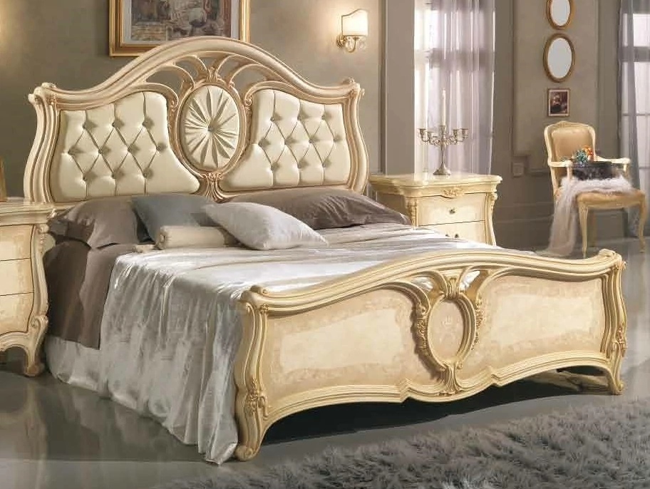 The upscale style of the classic bedroom set of this collection highlights the beige colored furniture and its golden details.