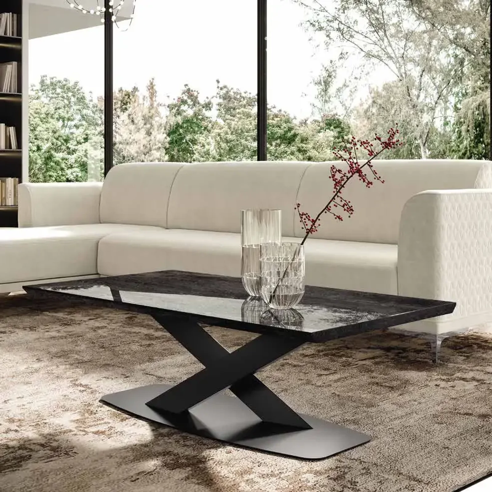 Italian Krystal coffee tables and complementary lamp tables elevate relaxation in your living room. Available with two different leg styles and either wooden or ceramic tops, they offer the perfect match for any interior. The 58 mm thick, polished, 45° bevel-edged wooden top harmonizes beautifully with the surfaces of the collection. The elegant ceramic tops come in five exclusive finishes, with 6 mm thick ceramic surfaces layered over 12 mm thick bevelled-edge glass. The hallmark of the Krystal living room collection is its uniquely designed metal legs that capture attention, while the Tent version offers a more streamlined, minimalist option to crown your living room.