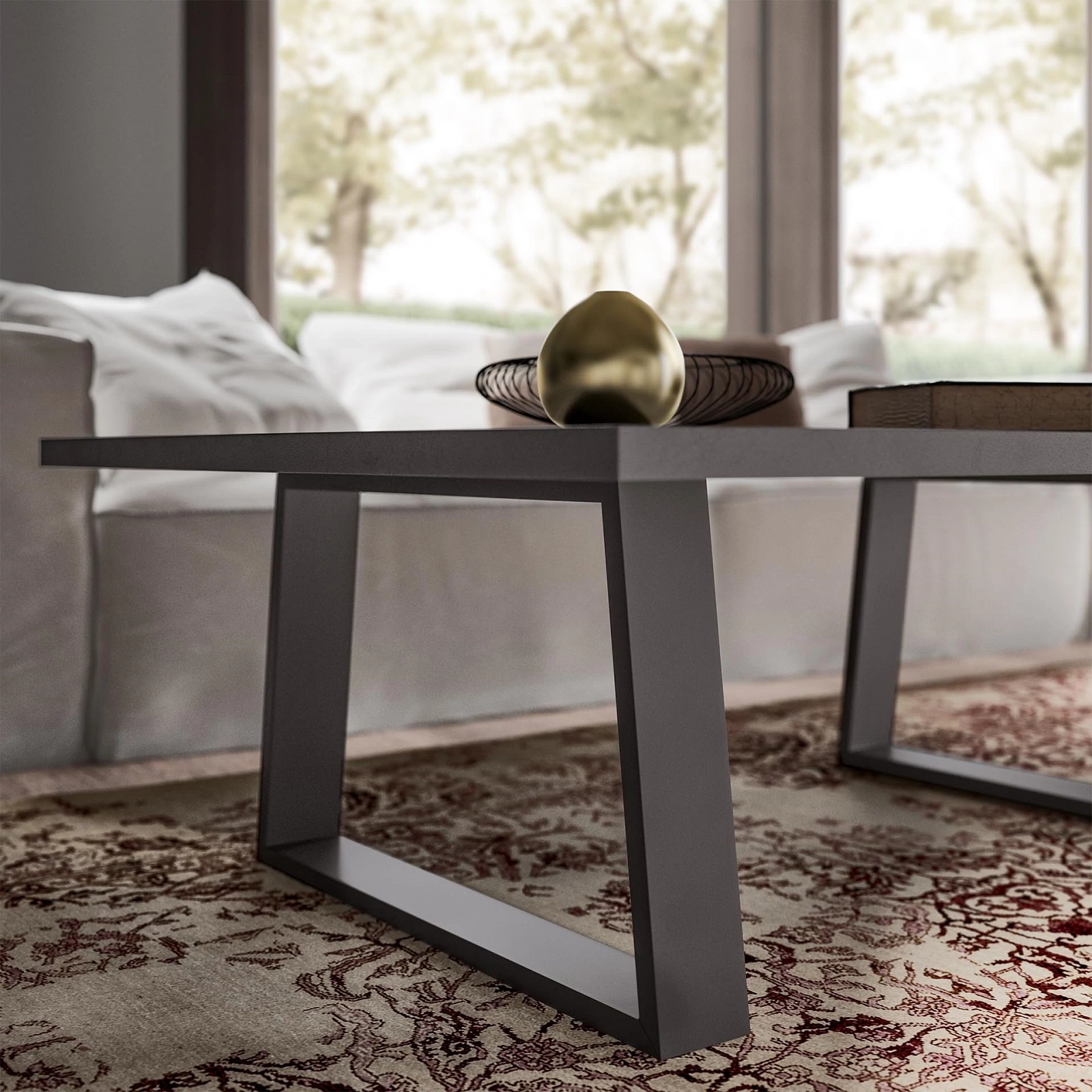 Cabinets, which also have a solid material and a clear, dark glass part, could not be more chic. The anthracite grey structure of the chairs is contrasted by the sand-colored leather. A coffee table with a sensual design, which is also modern thanks to its metal structure. The perfect mixture of beauty and expedience. TV commode with fashionable colors, modern shape, in perfect size, spiced with a little technology. Careful and elegant geometric design, excellent solution for arranging open or close spaces as well.