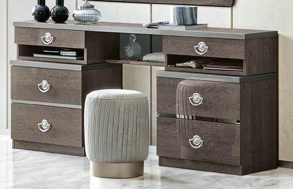 The drawers run on soft closing metal guides, whilst the inside is covered with a scratch resistant, fabric-looking material which can be cleaned with a soft cloth and light cleanser. The special handles in a glossy silver finish emphasise the glamour of the Nabucco bedroom. The look is then softened and made contemporary by the grey and silver striped edging.