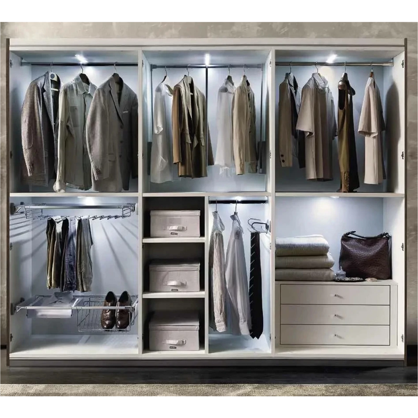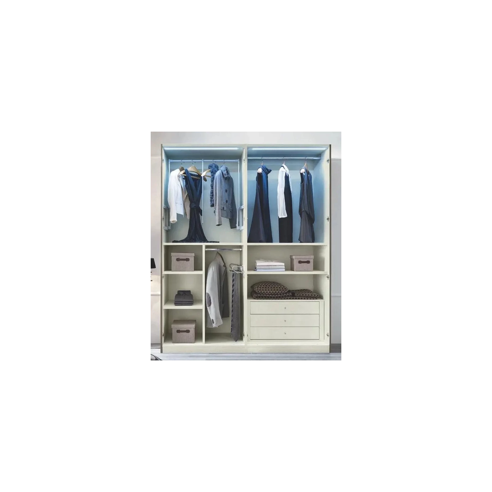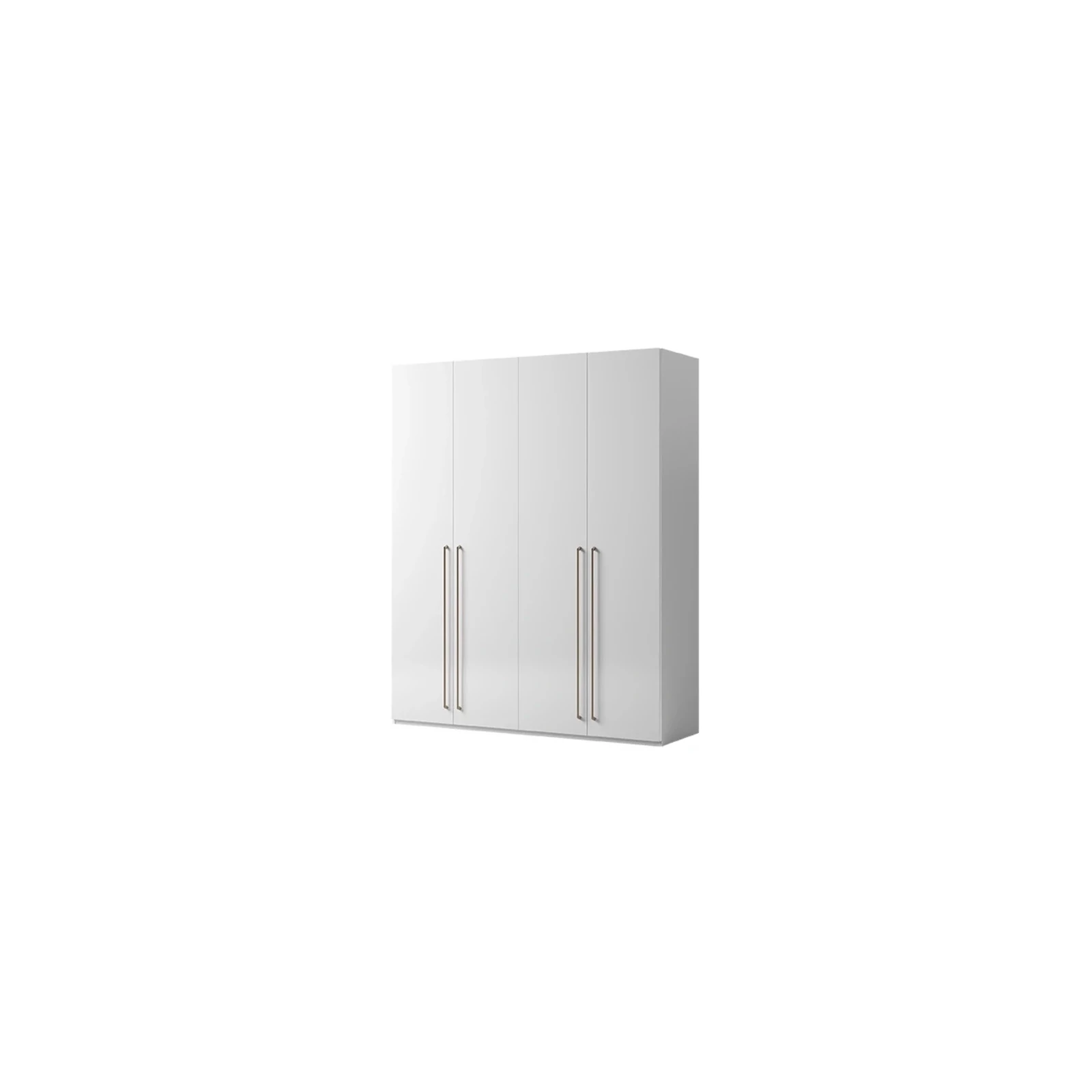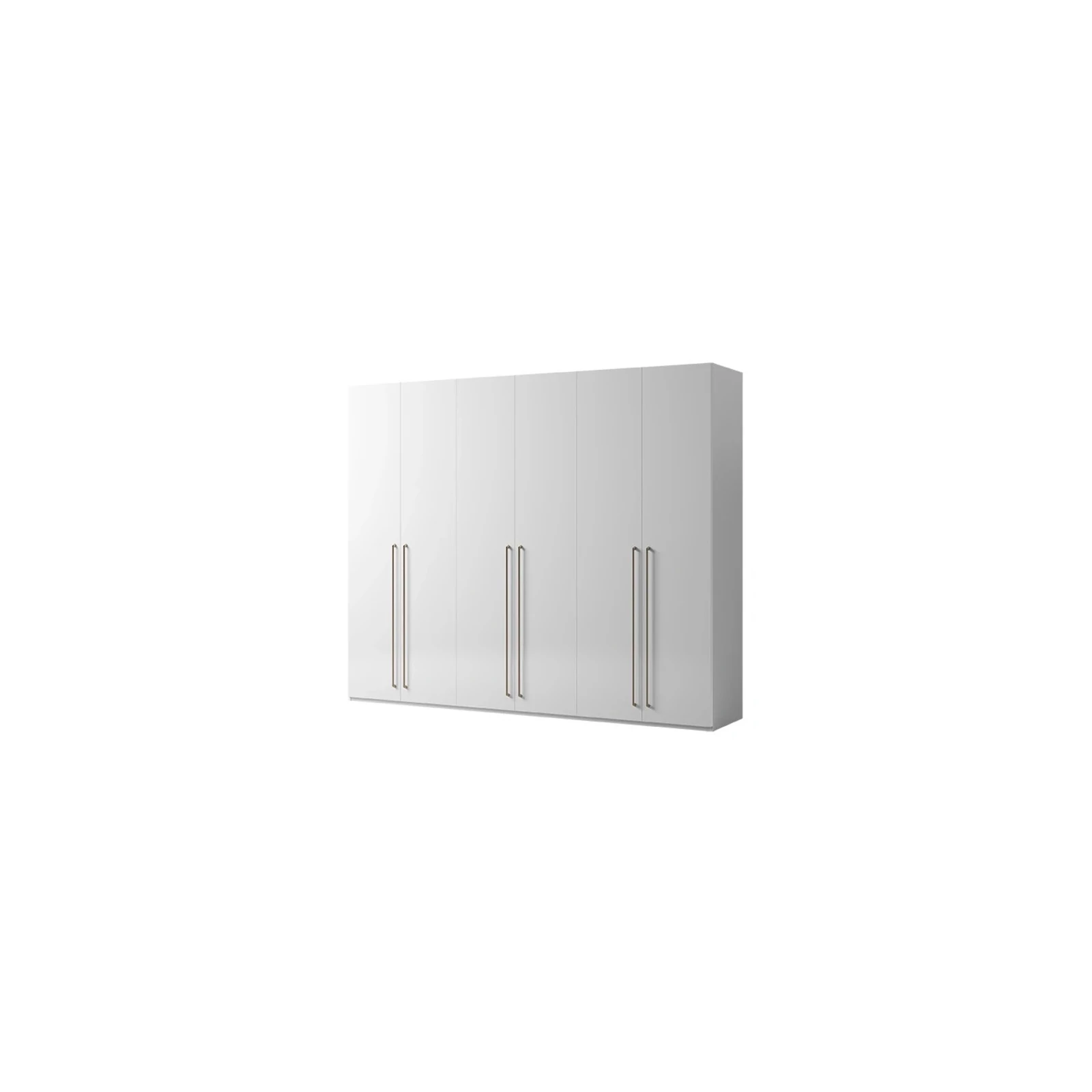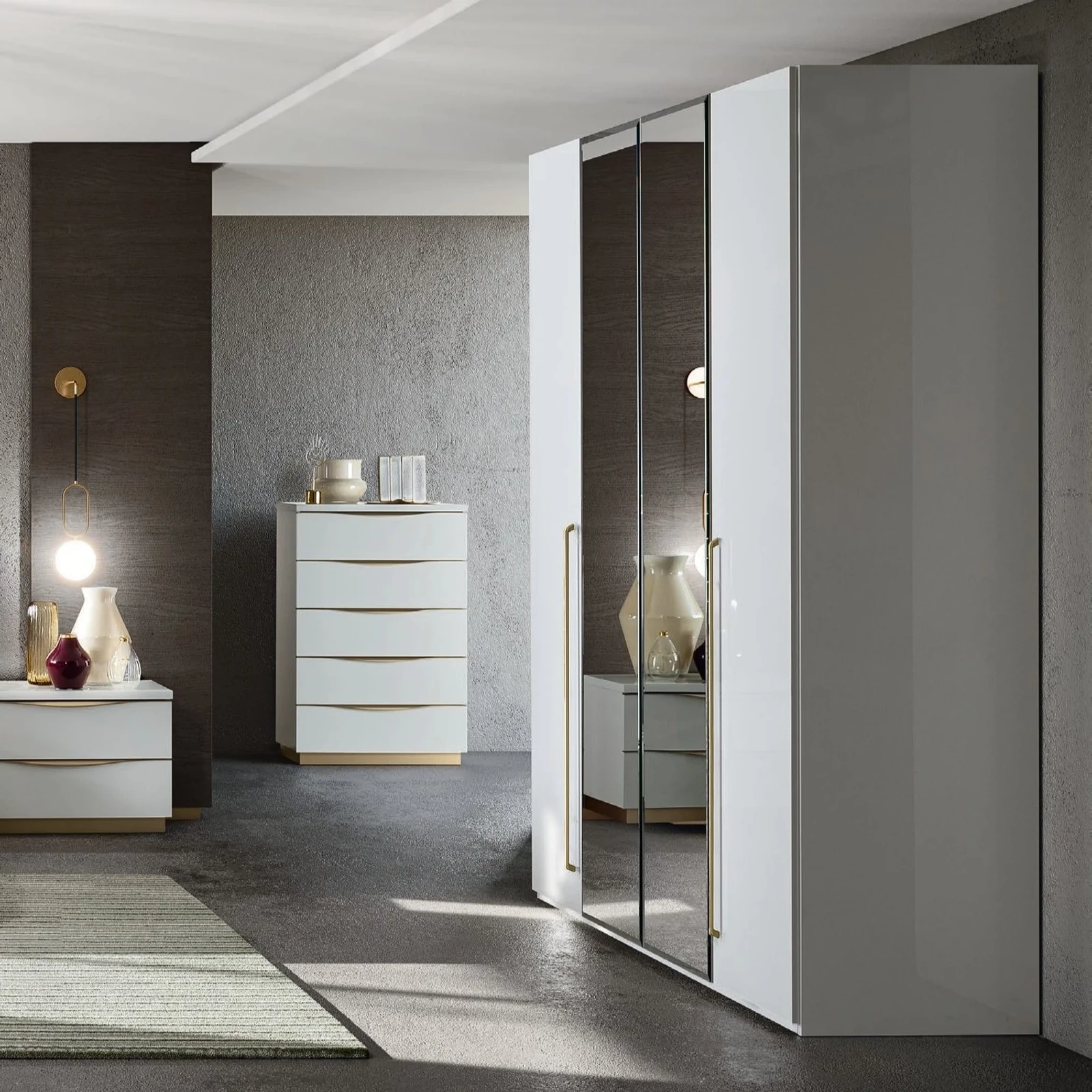 The modular Kharma wardrobe offers flexibility with different sizes and configurations to fit any bedroom. Its sleek white gloss finish and curved aluminum handles convey modern Italian style. With anti-scratch interiors, this high-quality wardrobe provides a durable, luxurious storage solution.