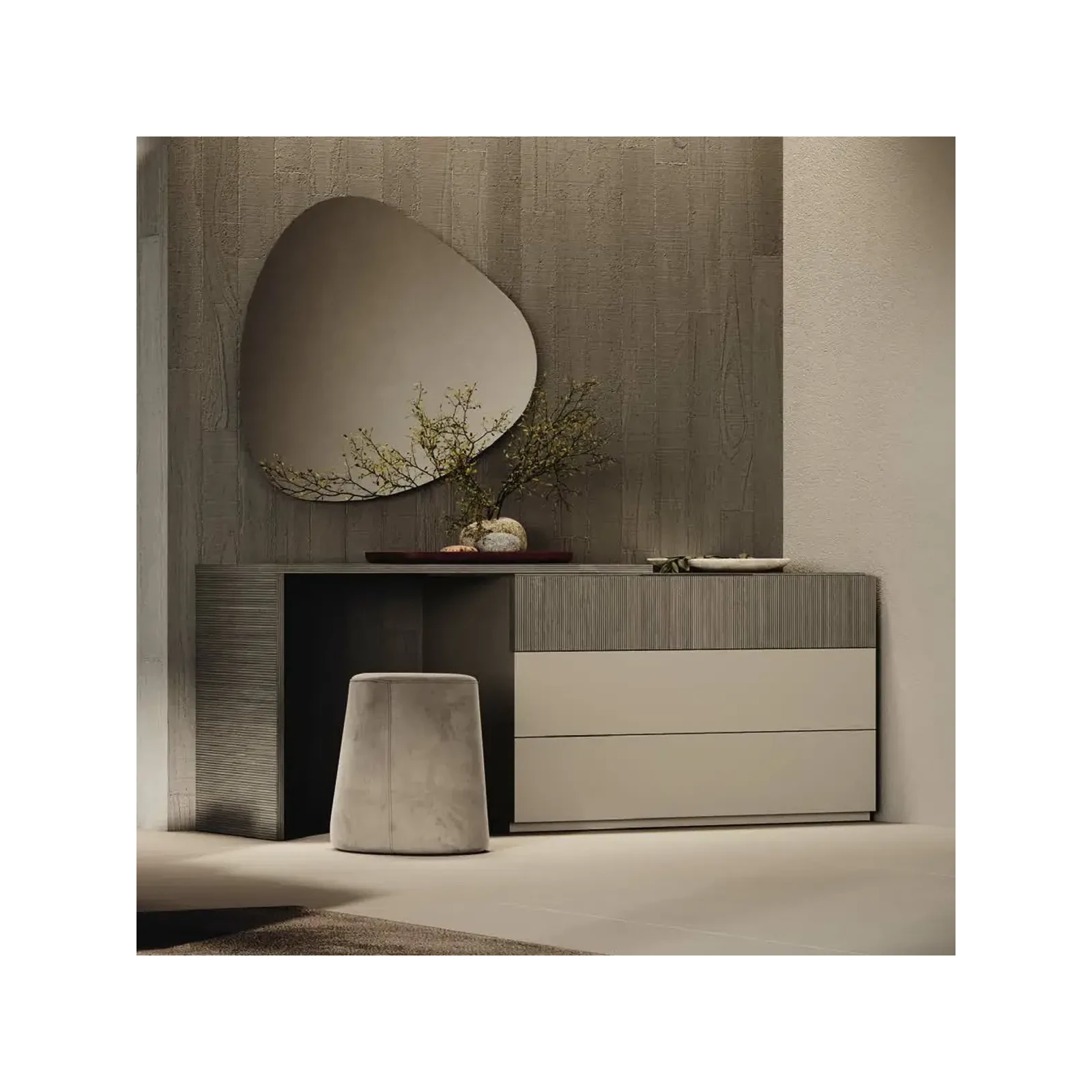 Silky textures, rhythmic surfaces, and clean shapes – in Essenza, both visual and tactile experiences play a role. A collection that invites and inspires, turning your bedroom into a true island of tranquility and beauty.