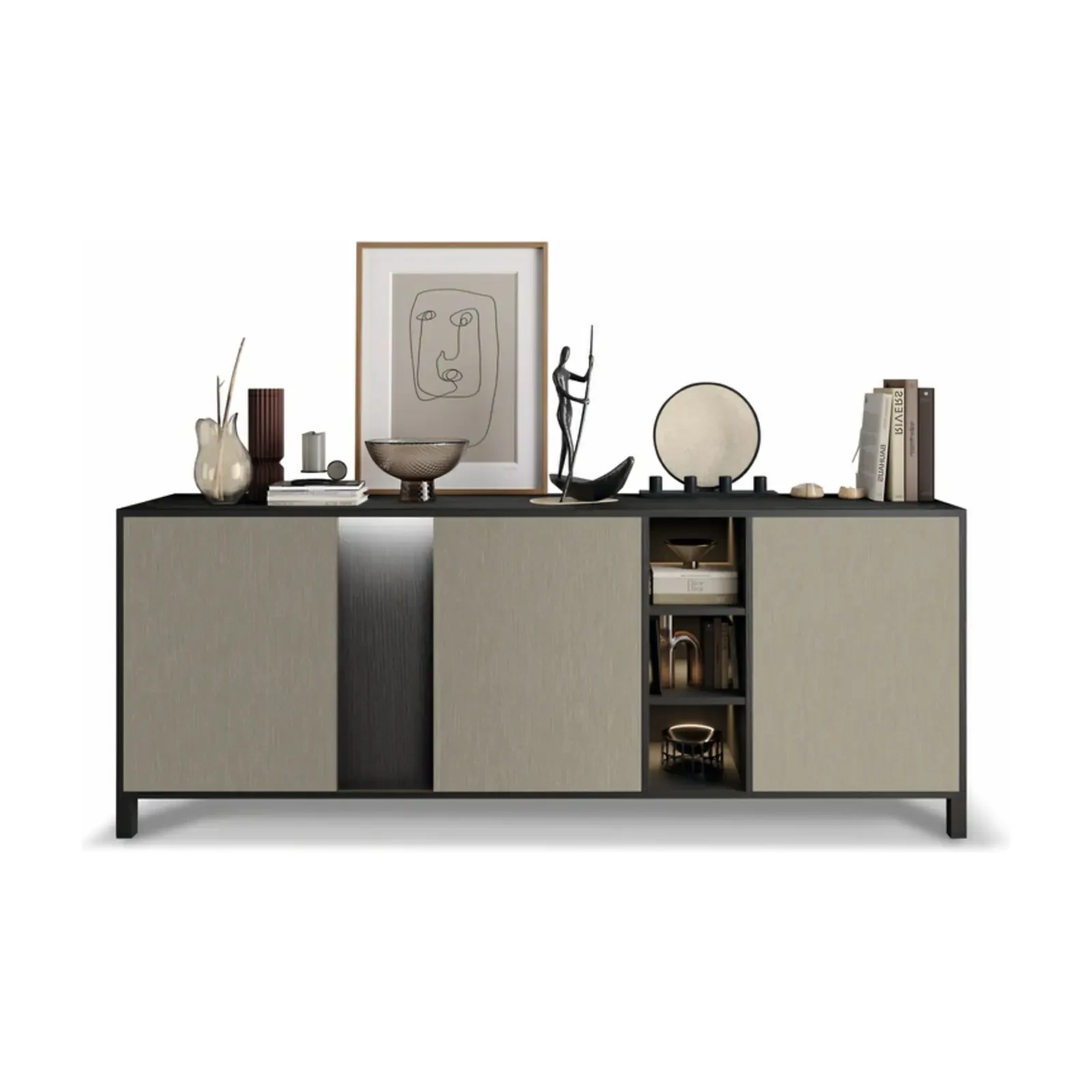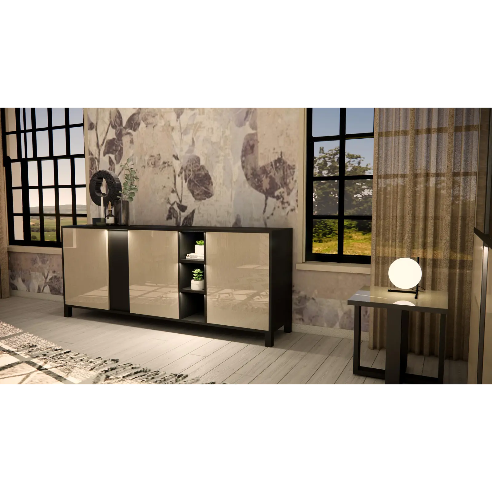 The sideboard is available in 2-door and 3-door versions, making it easy to adapt to rooms of various sizes. The spacious interior layout offers ample storage for dinnerware, glassware, or textiles, while maintaining a clean and modern look.