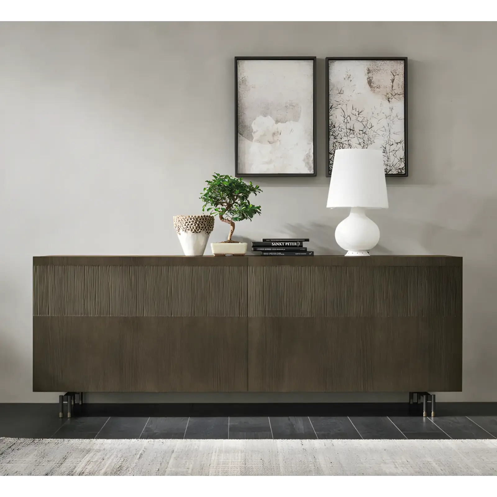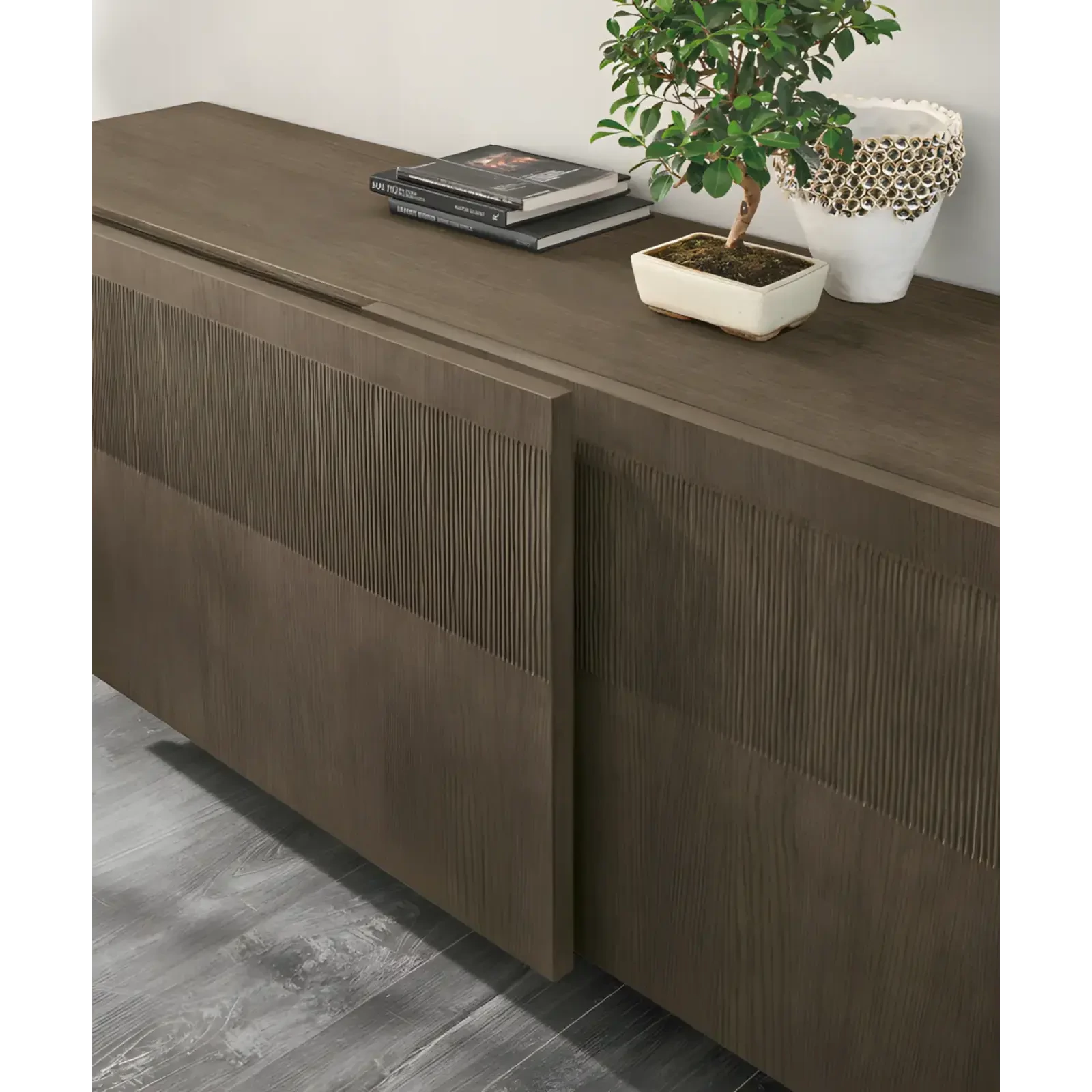 The sideboard is not only aesthetically pleasing but also functional, offering ample space for organizing everyday items. The contrast between smooth and ribbed surfaces adds subtle elegance, perfectly fitting modern interior design trends.
