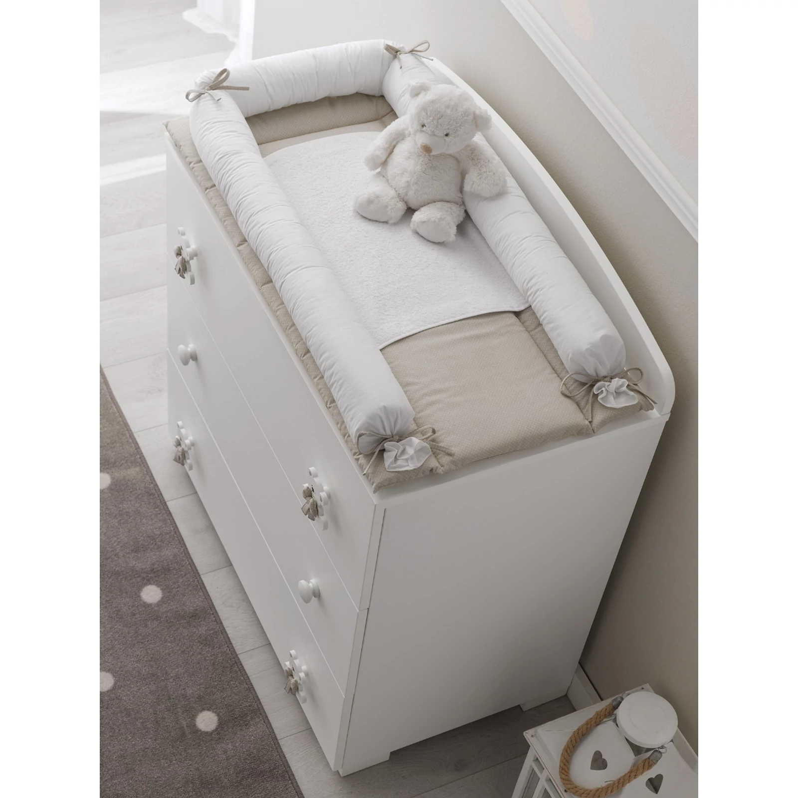 FURTHER ADJUSTMENTS AND DRAWER: Once the baby grows enough to get on and off by its self from the crib you can easily take off one of the side-rails: move the side-rail to lower it down and while doing this pull the lower part of it towards you till you hear a click and the two pins of guide-rail come off, then lower it down to the holes and take off the side-rail. Wide drawer made of chipboard covered with PVC material easy to use from both sides of the crib.