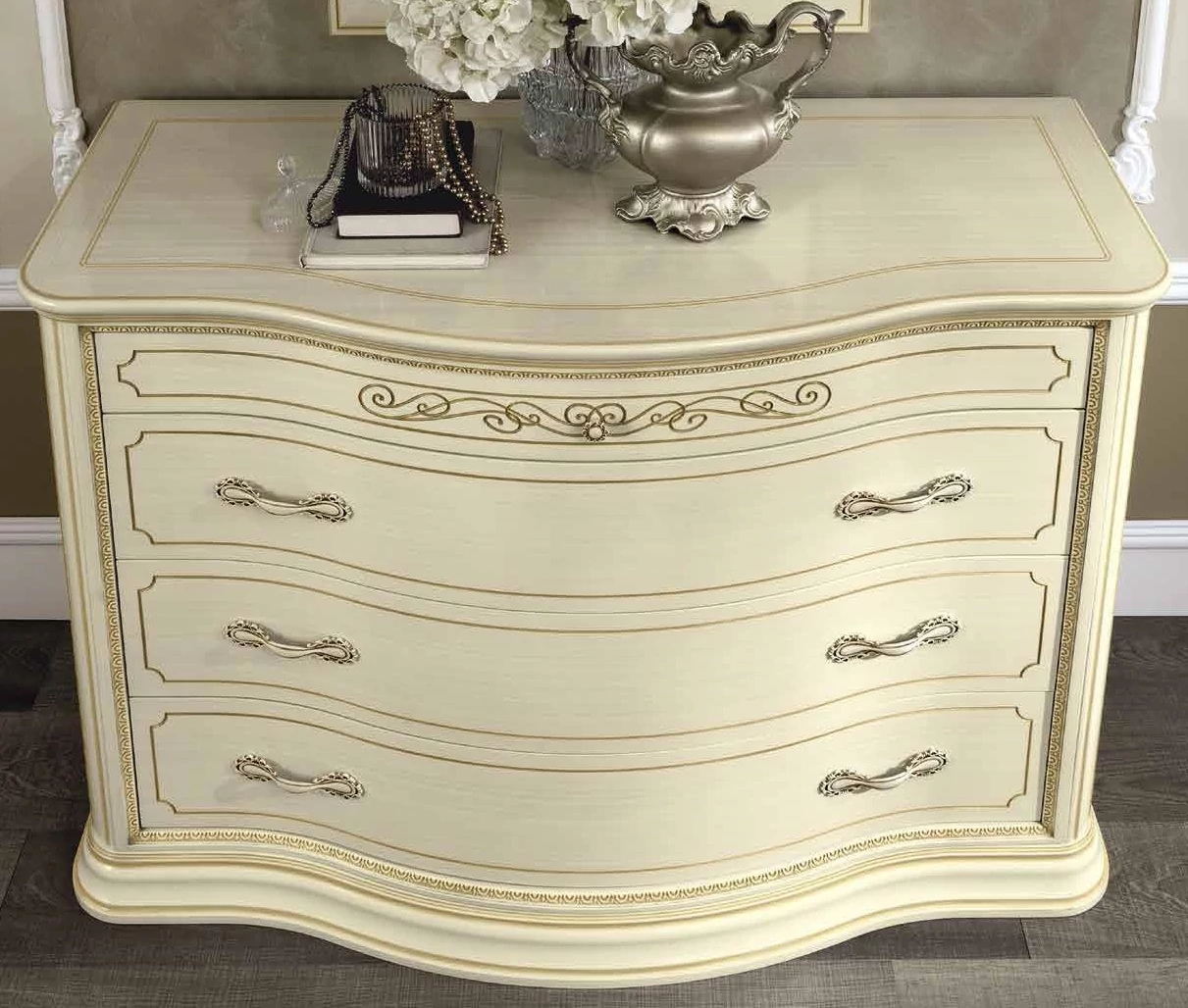 Every chest of drawers, night table, buffet chest of drawers and several other component has a 25 mm thick top with a decoration carved in real tulip tree, which make the appearance of the furniture meaningful and serious. We can find even 3 cm thick hardwood frames on which all features of real Italian traditional furniture making can be seen: they are born in the spirit of quality, design and durability. Choose exactly the components that will make your home very beautiful, since the sets can be ordered also per component, at no extra charge!