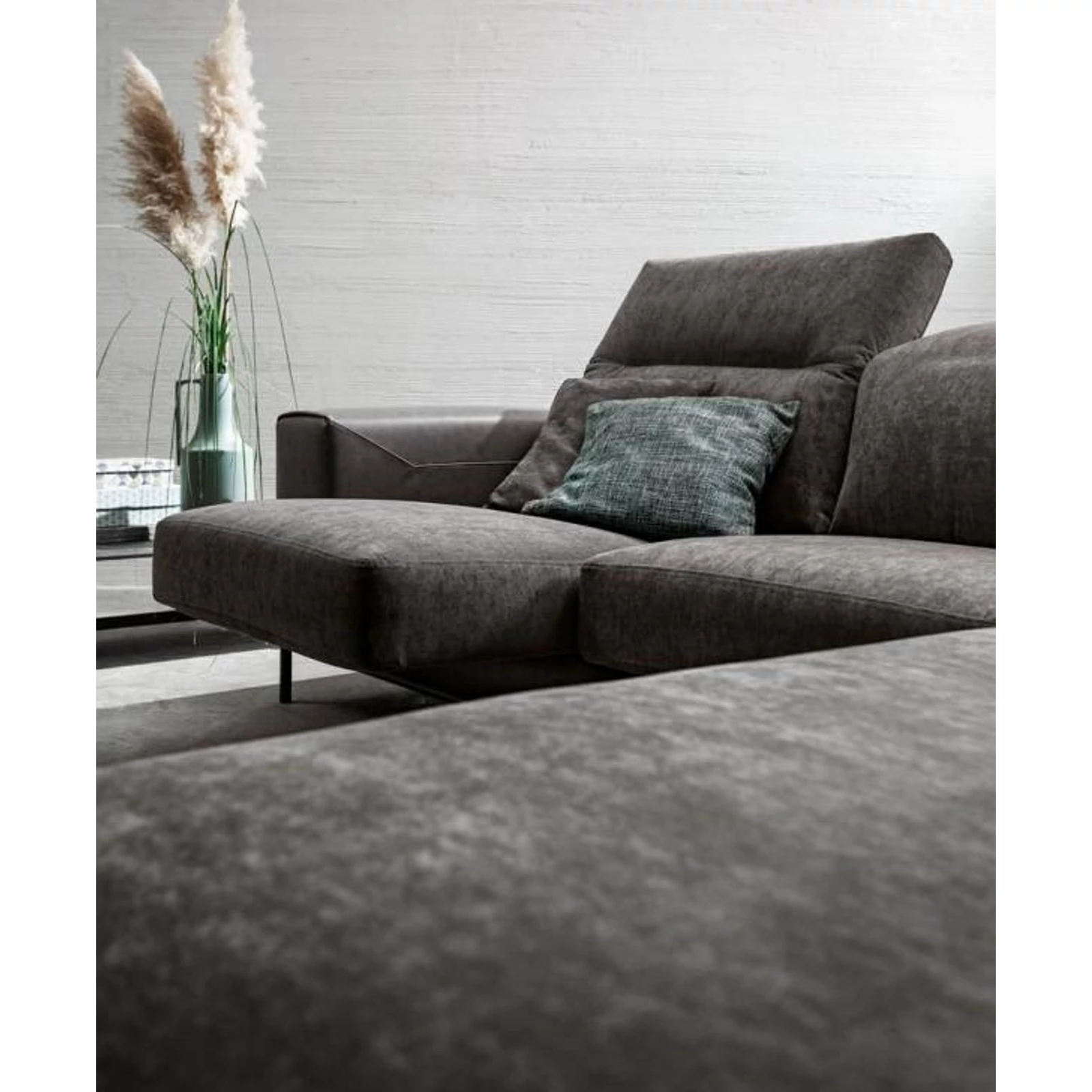 The soft, rounded curves of the Zippy and Zippy Special sofas draw attention with refined elegance. Generous seats with comfortable lumbar support and manually adjustable, multi‑position headrests provide comfort for any activity. The two versions differ in the leg design. A model belonging to the Samoa Mooving collection.